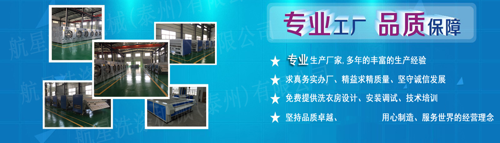 航星洗滌機(jī)械(泰州)有限公司位于江蘇泰州,是生產(chǎn)制造服裝洗滌機(jī)械、洗衣房設(shè)備,賓館、酒店等洗衣房設(shè)備的專業(yè)廠家,自創(chuàng)辦以為憑借著優(yōu)秀的產(chǎn)品較高性價比、售后服務(wù)好等特點,獲得了較多消費(fèi)者的好評. 我公司主要提供洗滌機(jī)械、洗滌設(shè)備、洗衣設(shè)備等產(chǎn)品的開發(fā)生產(chǎn)與銷售,所銷售的洗滌機(jī)械產(chǎn)品,型號齊全、規(guī)格多樣,其中有:工業(yè)洗衣機(jī)、洗脫兩用機(jī)、洗脫烘一體機(jī)、服裝石磨水洗機(jī)、襪子染色機(jī)、絲綢砂洗機(jī)、脫水機(jī)、脫油機(jī)、脫油烘干機(jī)、烘干機(jī)、燙、熨平機(jī)、蒸氣燙臺、地毯清洗機(jī)等 洗滌機(jī)械產(chǎn)品。產(chǎn)品廣泛應(yīng)用于紡織、水洗廠、漂染廠、砂洗廠、印染、絲綢、服裝以及化工乳膠業(yè)、賓館、飯店、醫(yī)院、招待所等行業(yè)。    我公司堅持“以質(zhì)量求生存,以科技發(fā)展為目標(biāo)”的企業(yè)宗旨,不斷提高關(guān)鍵工序的生產(chǎn)能力,建設(shè)現(xiàn)代化企業(yè)管理制度,開拓市場,加強(qiáng)國內(nèi)國外銷售網(wǎng)絡(luò)。我公司注重產(chǎn)品質(zhì)量和信譽(yù),產(chǎn)品不僅暢銷全國而且出口東南亞等地。 航星洗滌機(jī)械(泰州)有限公司竭誠歡迎國內(nèi)外客戶到我公司進(jìn)行參觀及購買我公司的洗滌機(jī)械產(chǎn)品,我公司相信規(guī)格齊全、價格公道的洗滌機(jī)械產(chǎn)品總有一款適合您。